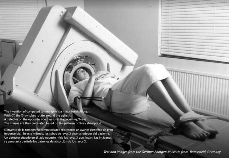 La invención de la tomografía computarizada es un gran avance. En la TC, los tubos de rayos X giran alrededor del paciente. Un detector en el lado opuesto mide los rayos X entrantes. Las imágenes se calculan a partir de los patrones de absorción de rayos X.